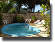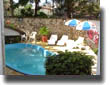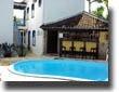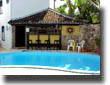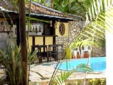 Piscina com cascata e bar.